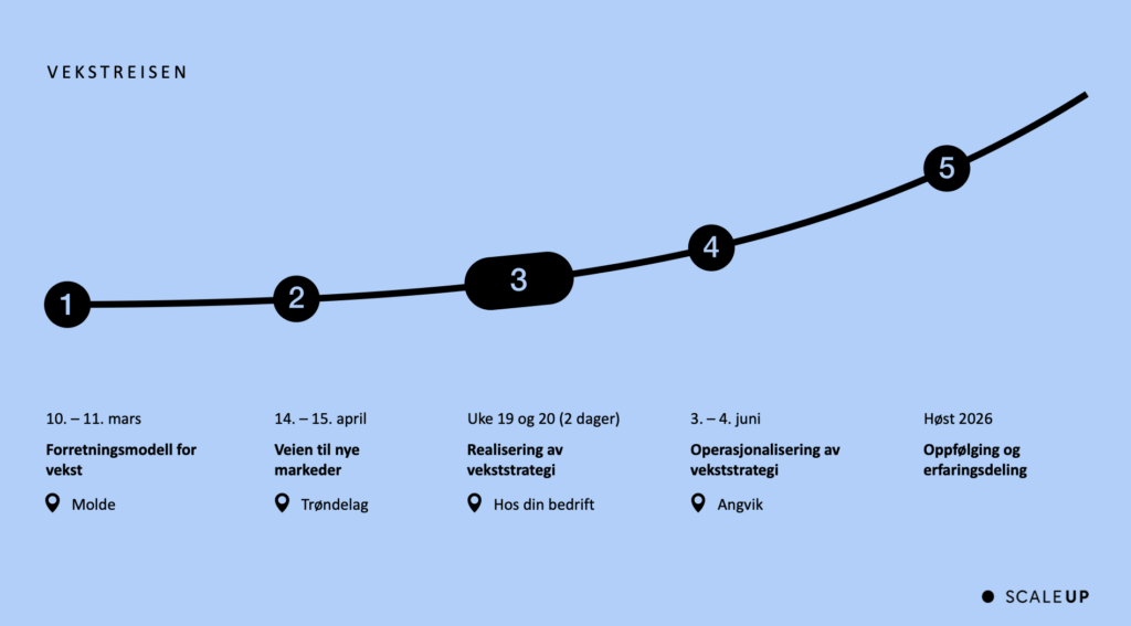 Gjennom programmet får lederteamet verktøyene, innsikten og støtten som trengs for å utvikle en vekststrategi som faktisk kan realiseres i praksis.